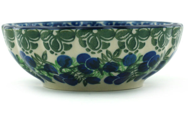 This Blueberry Fields Forever 5" Scalloped Fluted Bowl was handmade and hand decorated in Boleslawiec, Poland by skilled artisans according to old traditional methods. This Polish stoneware is microwave, dishwasher, freezer, and oven safe up to 480°F. It does not contain lead or cadmium. It is part of the Blueberry Fields Forever Collection.
