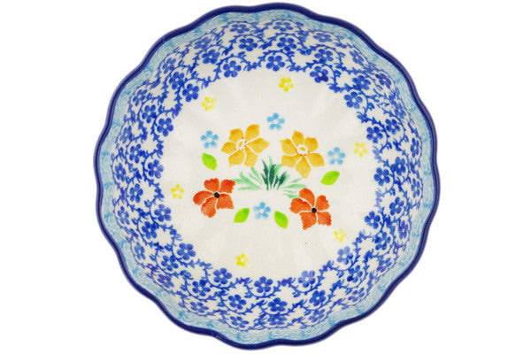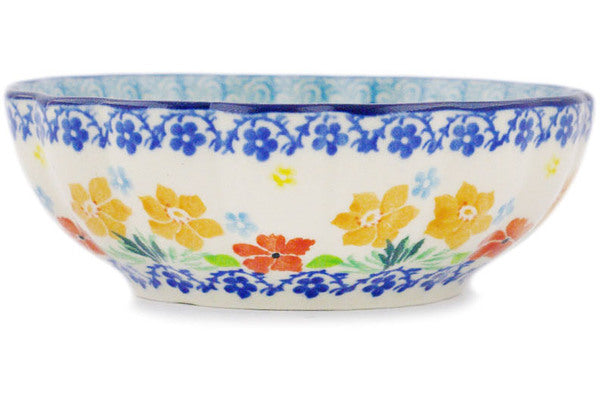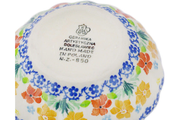 This Creamy Saffron 5" Scalloped Fluted Bowl was handmade and hand decorated in Boleslawiec, Poland by skilled artisans according to old traditional methods. This Polish stoneware is microwave, dishwasher, freezer, and oven safe up to 480°F. It does not contain lead or cadmium. It is part of the Creamy Saffron Collection.