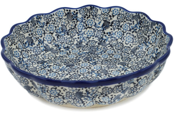 This Walking At Night 8" Scalloped Fluted Bowl was handmade and hand decorated in Boleslawiec, Poland by skilled artisans according to old traditional methods. This is a Polish pottery Signature Unikat, which means that it has been hand painted with both sponges and brushes and it is signed by the artist who painted it. Unikat pieces are the most intricate works of art. Larger Unikat items take hours of very careful work to finish. This Polish stoneware is microwave, dishwasher, freezer, and oven safe up to 480°F. It does not contain lead or cadmium. It is part of the Walking At Night Collection.
