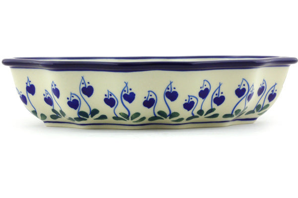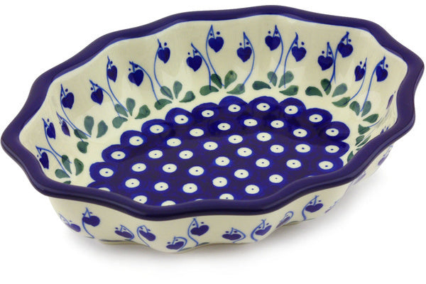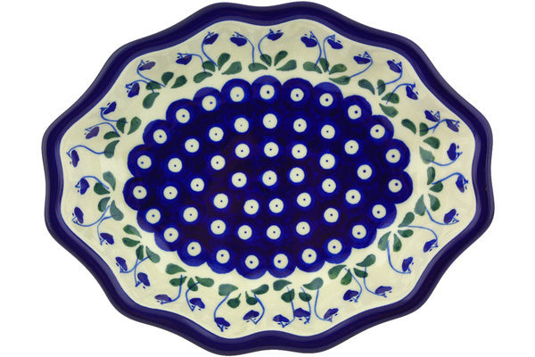 This Bleeding Heart Peacock 9" Serving Bowl was handmade and hand decorated in Boleslawiec, Poland by skilled artisans according to old traditional methods. This Polish stoneware is microwave, dishwasher, freezer, and oven safe up to 480°F. It does not contain lead or cadmium. It is part of the Bleeding Heart Peacock Collection.