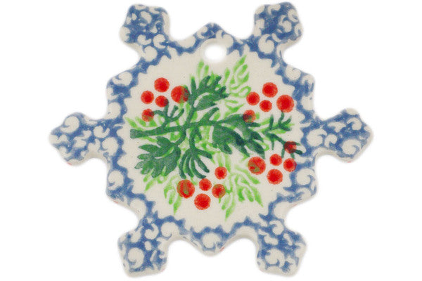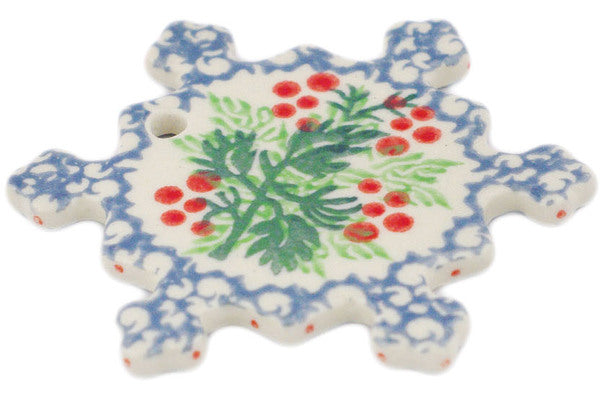 This Red Rowan 3" Snowflake Pendant was handmade and hand decorated in Boleslawiec, Poland by skilled artisans according to old traditional methods. This Polish stoneware is microwave, dishwasher, freezer, and oven safe up to 480°F. It does not contain lead or cadmium. It is part of the Red Rowan Collection.