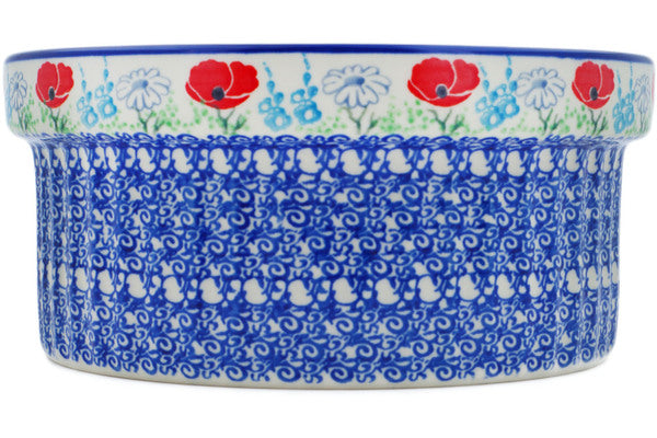 This Poppy Happiness 8" Souffle Dish was handmade and hand decorated in Boleslawiec, Poland by skilled artisans according to old traditional methods. This Polish stoneware is microwave, dishwasher, freezer, and oven safe up to 480°F. It does not contain lead or cadmium. It is part of the Poppy Happiness Collection.