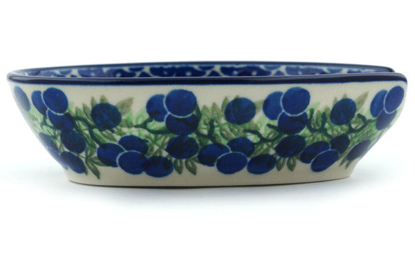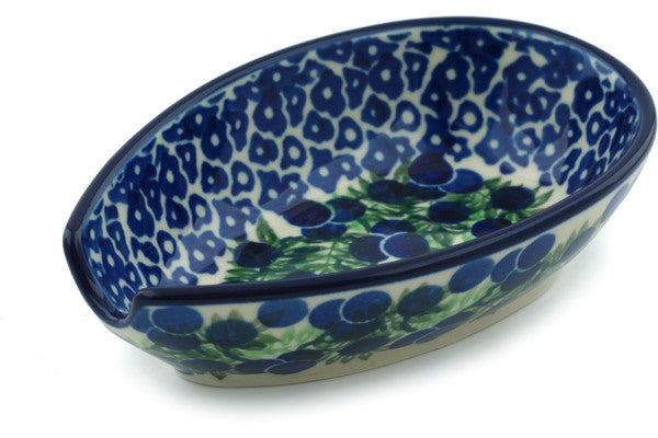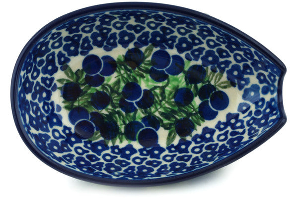 This Blueberry Fields Forever 5" Spoon Rest was handmade and hand decorated in Boleslawiec, Poland by skilled artisans according to old traditional methods. This Polish stoneware is microwave, dishwasher, freezer, and oven safe up to 480°F. It does not contain lead or cadmium. It is part of the Blueberry Fields Forever Collection.