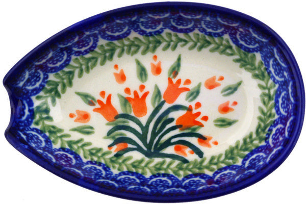 This Crimson Bells 5" Spoon Rest was handmade and hand decorated in Boleslawiec, Poland by skilled artisans according to old traditional methods. This Polish stoneware is microwave, dishwasher, freezer, and oven safe up to 480°F. It does not contain lead or cadmium. It is part of the Crimson Bells Collection.