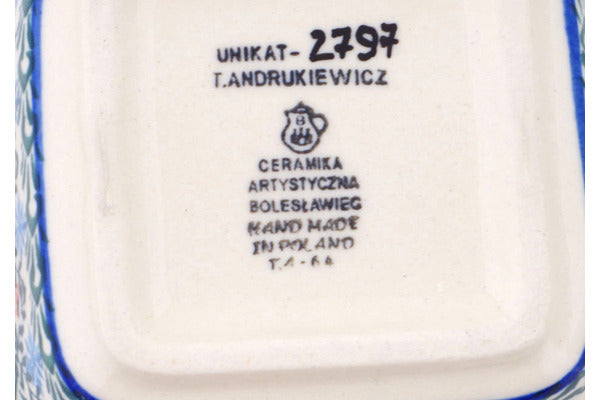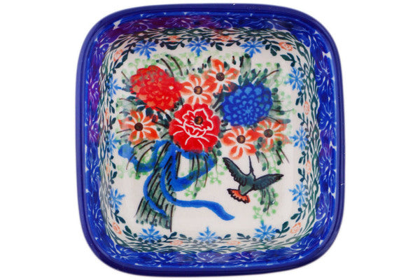 This Hummingbird Bouquet 4" Square Bowl was handmade and hand decorated in Boleslawiec, Poland by skilled artisans according to old traditional methods. This is a Polish pottery Signature Unikat, which means that it has been hand painted with both sponges and brushes and it is signed by the artist who painted it. Unikat pieces are the most intricate works of art. Larger Unikat items take hours of very careful work to finish. This Polish stoneware is microwave, dishwasher, freezer, and oven safe up to 480°F. It does not contain lead or cadmium. It is part of the Hummingbird Bouquet Collection.