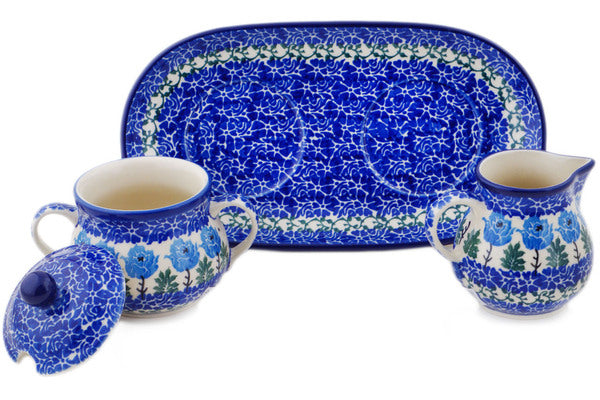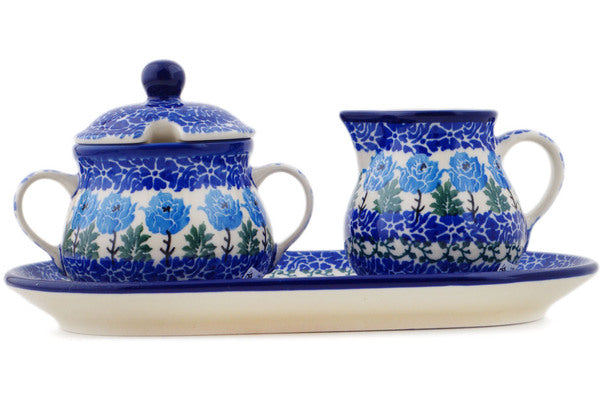 This Blue Rosette Wreath 10" Sugar and Creamer Set was handmade and hand decorated in Boleslawiec, Poland by skilled artisans according to old traditional methods. This Polish stoneware is microwave, dishwasher, freezer, and oven safe up to 480°F. It does not contain lead or cadmium. It is part of the Blue Rosette Wreath Collection.