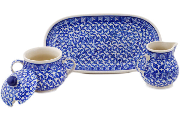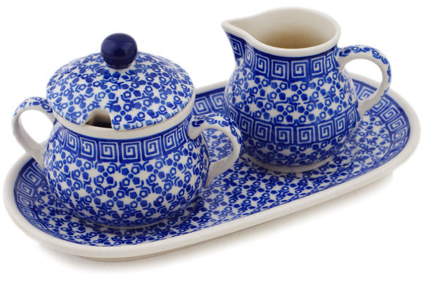 This Grecian Vines 10" Sugar and Creamer Set was handmade and hand decorated in Boleslawiec, Poland by skilled artisans according to old traditional methods. This Polish stoneware is microwave, dishwasher, freezer, and oven safe up to 480°F. It does not contain lead or cadmium. It is part of the Grecian Vines Collection.