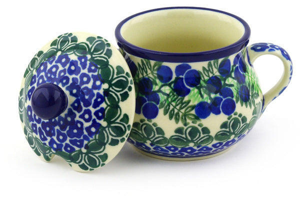 This Blueberry Fields Forever 7 oz Sugar Bowl was handmade and hand decorated in Boleslawiec, Poland by skilled artisans according to old traditional methods. This Polish stoneware is microwave, dishwasher, freezer, and oven safe up to 480°F. It does not contain lead or cadmium. It is part of the Blueberry Fields Forever Collection.