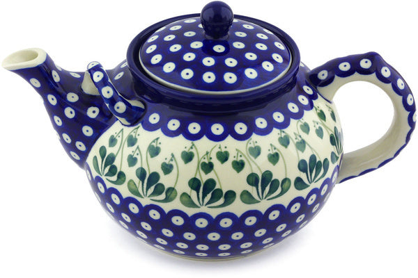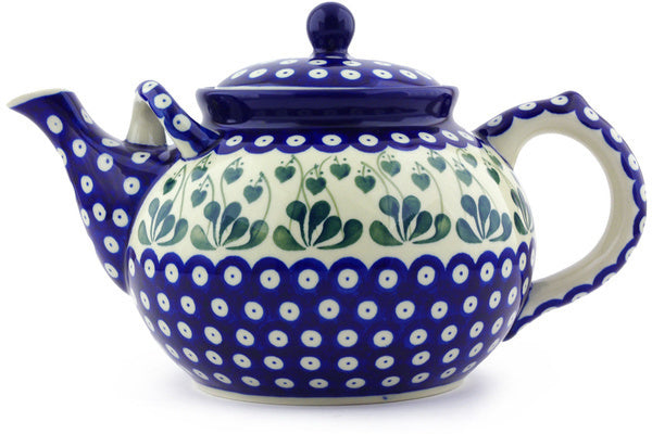 This Bleeding Heart Peacock 7 cups Tea or Coffee Pot was handmade and hand decorated in Boleslawiec, Poland by skilled artisans according to old traditional methods. This Polish stoneware is microwave, dishwasher, freezer, and oven safe up to 480°F. It does not contain lead or cadmium. It is part of the Bleeding Heart Peacock Collection.