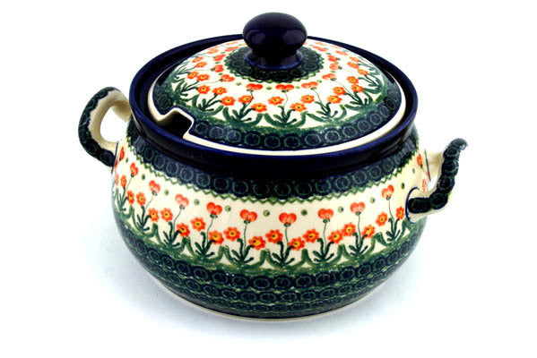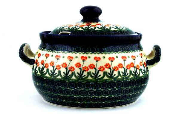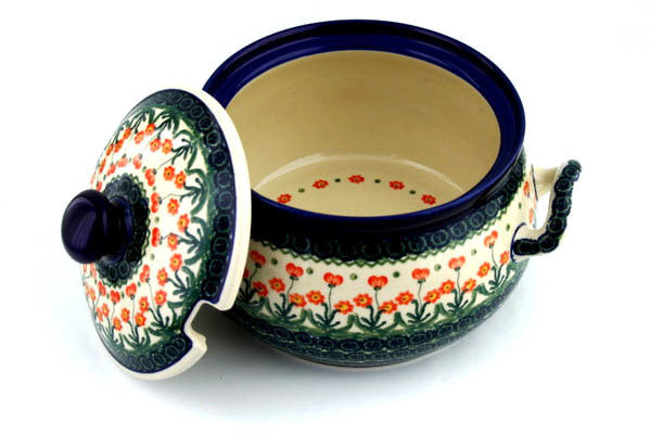 This Peach Spring Daisy 122 oz Tureen was handmade and hand decorated in Boleslawiec, Poland by skilled artisans according to old traditional methods. This Polish stoneware is microwave, dishwasher, freezer, and oven safe up to 480°F. It does not contain lead or cadmium. It is part of the Peach Spring Daisy Collection.