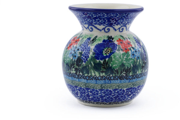 This Mariposa 4" Vase was handmade and hand decorated in Boleslawiec, Poland by skilled artisans according to old traditional methods. This is a Polish pottery Signature Unikat, which means that it has been hand painted with both sponges and brushes and it is signed by the artist who painted it. Unikat pieces are the most intricate works of art. Larger Unikat items take hours of very careful work to finish. This Polish stoneware is microwave, dishwasher, freezer, and oven safe up to 480°F. It does not contain lead or cadmium. It is part of the Mariposa Collection.