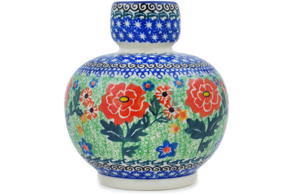 This Bold Carnation 6" Vase was handmade and hand decorated in Boleslawiec, Poland by skilled artisans according to old traditional methods. This is a Polish pottery Signature Unikat, which means that it has been hand painted with both sponges and brushes and it is signed by the artist who painted it. Unikat pieces are the most intricate works of art. Larger Unikat items take hours of very careful work to finish. This Polish stoneware is microwave, dishwasher, freezer, and oven safe up to 480°F. It does not contain lead or cadmium. It is part of the Bold Carnation Collection.