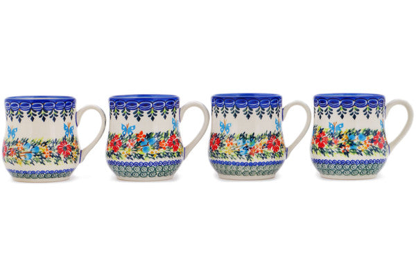 This Ring Of Flowers 4 Mugs was handmade and hand decorated in Boleslawiec, Poland by skilled artisans according to old traditional methods. This is a Polish pottery Signature Unikat, which means that it has been hand painted with both sponges and brushes and it is signed by the artist who painted it. Unikat pieces are the most intricate works of art. Larger Unikat items take hours of very careful work to finish. This Polish stoneware is microwave, dishwasher, freezer, and oven safe up to 480°F. It does not contain lead or cadmium. It is part of the Ring Of Flowers Collection.