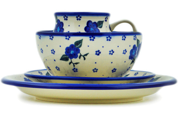 This Blue Poppies Spring 4-Piece Place Setting was handmade and hand decorated in Boleslawiec, Poland by skilled artisans according to old traditional methods. This Polish stoneware is microwave, dishwasher, freezer, and oven safe up to 480°F. It does not contain lead or cadmium. It is part of the Blue Poppies Spring Collection.