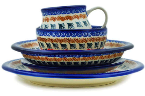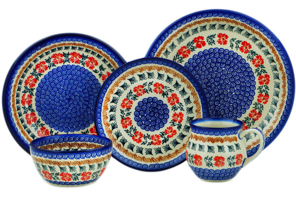 This Red Cornflower 5-Piece Place Setting was handmade and hand decorated in Boleslawiec, Poland by skilled artisans according to old traditional methods. This Polish stoneware is microwave, dishwasher, freezer, and oven safe up to 480°F. It does not contain lead or cadmium. It is part of the Red Cornflower Collection.