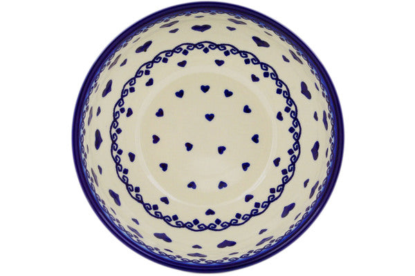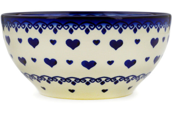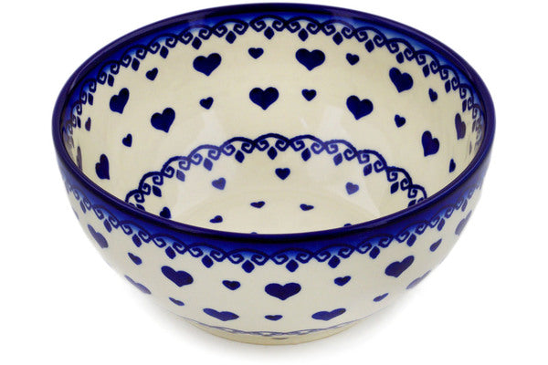 This Blue Valentine Hearts 6" Bowl was handmade and hand decorated in Boleslawiec, Poland by skilled artisans according to old traditional methods. This Polish stoneware is microwave, dishwasher, freezer, and oven safe up to 480°F. It does not contain lead or cadmium. It is part of the Blue Valentine Hearts Collection.