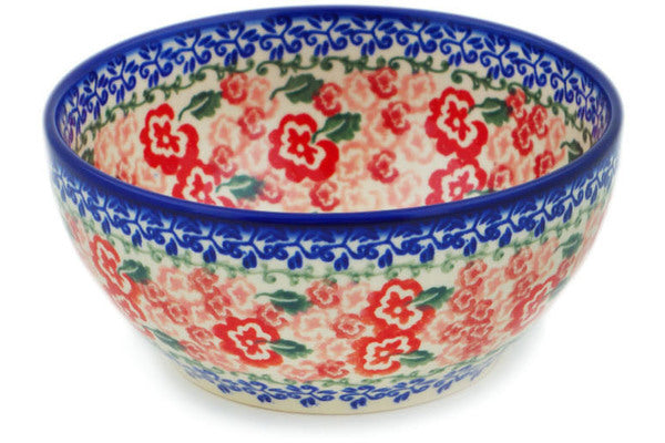 This Fluctuating Pansy's 5" Bowl was handmade and hand decorated in Boleslawiec, Poland by skilled artisans according to old traditional methods. This Polish stoneware is microwave, dishwasher, freezer, and oven safe up to 480°F. It does not contain lead or cadmium. It is part of the Fluctuating Pansy's Collection.