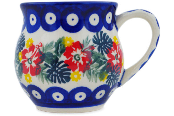 This Tropical Peacock 8 oz Bubble Mug was handmade and hand decorated in Boleslawiec, Poland by skilled artisans according to old traditional methods. This is a Polish pottery Signature Unikat, which means that it has been hand painted with both sponges and brushes and it is signed by the artist who painted it. Unikat pieces are the most intricate works of art. Larger Unikat items take hours of very careful work to finish. This Polish stoneware is microwave, dishwasher, freezer, and oven safe up to 480°F. It does not contain lead or cadmium. It is part of the Tropical Peacock Collection.