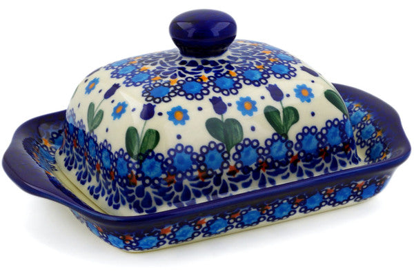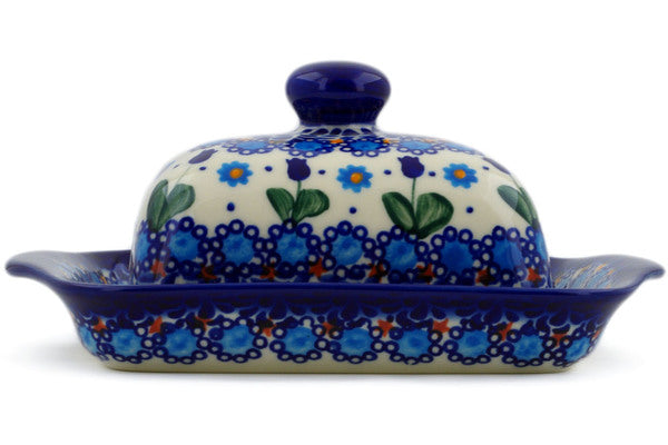 This Blue Tulip Garden 7" Butter Dish was handmade and hand decorated in Boleslawiec, Poland by skilled artisans according to old traditional methods. This is a Polish pottery Signature Unikat, which means that it has been hand painted with both sponges and brushes and it is signed by the artist who painted it. Unikat pieces are the most intricate works of art. Larger Unikat items take hours of very careful work to finish. This Polish stoneware is microwave, dishwasher, freezer, and oven safe up to 480°F. It does not contain lead or cadmium. It is part of the Blue Tulip Garden Collection.