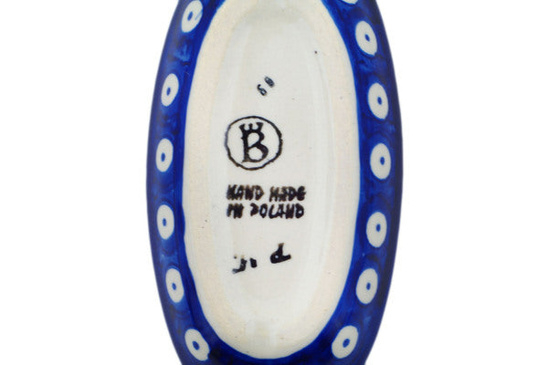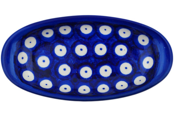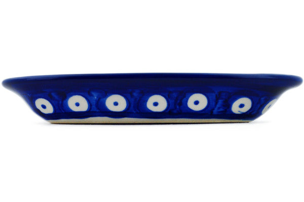 This Blue Eyed Peacock 6" Condiment Dish was handmade and hand decorated in Boleslawiec, Poland by skilled artisans according to old traditional methods. This Polish stoneware is microwave, dishwasher, freezer, and oven safe up to 480°F. It does not contain lead or cadmium. It is part of the Blue Eyed Peacock Collection.