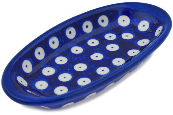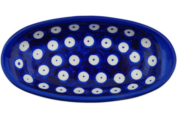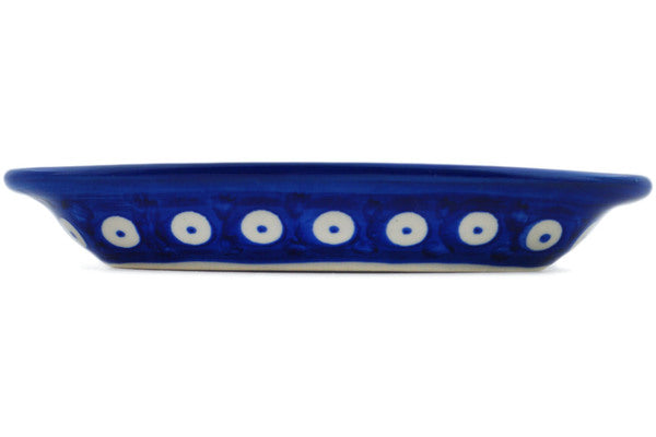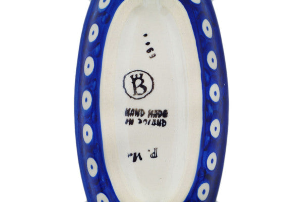 This Blue Eyed Peacock 6" Condiment Dish was handmade and hand decorated in Boleslawiec, Poland by skilled artisans according to old traditional methods. This Polish stoneware is microwave, dishwasher, freezer, and oven safe up to 480°F. It does not contain lead or cadmium. It is part of the Blue Eyed Peacock Collection.