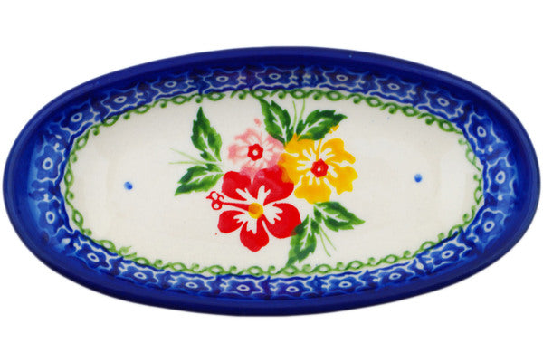 This Hibiscus Splendor 6" Condiment Dish was handmade and hand decorated in Boleslawiec, Poland by skilled artisans according to old traditional methods. This Polish stoneware is microwave, dishwasher, freezer, and oven safe up to 480°F. It does not contain lead or cadmium. It is part of the Hibiscus Splendor Collection.