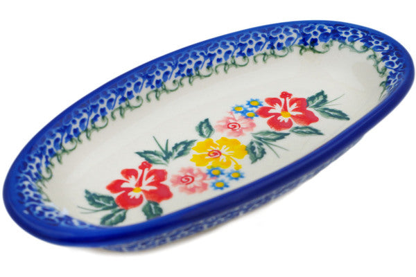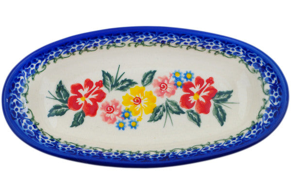 This Hibiscus Haven 7" Condiment Dish was handmade and hand decorated in Boleslawiec, Poland by skilled artisans according to old traditional methods. This Polish stoneware is microwave, dishwasher, freezer, and oven safe up to 480°F. It does not contain lead or cadmium. It is part of the Hibiscus Haven Collection.