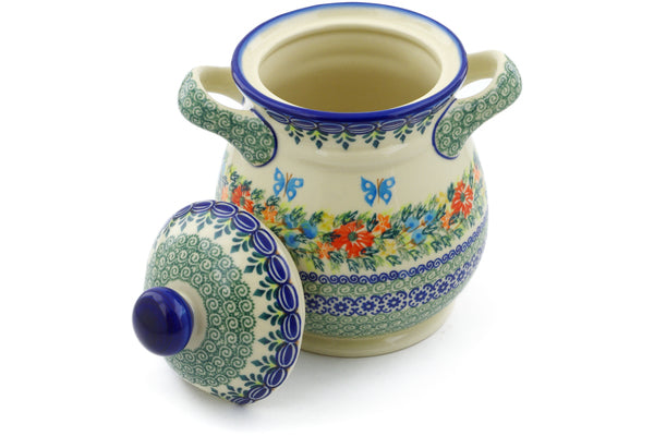 This Ring Of Flowers 8" Jar with Lid and Handles was handmade and hand decorated in Boleslawiec, Poland by skilled artisans according to old traditional methods. This is a Polish pottery Signature Unikat, which means that it has been hand painted with both sponges and brushes and it is signed by the artist who painted it. Unikat pieces are the most intricate works of art. Larger Unikat items take hours of very careful work to finish. This Polish stoneware is microwave, dishwasher, freezer, and oven safe up to 480°F. It does not contain lead or cadmium. It is part of the Ring Of Flowers Collection.