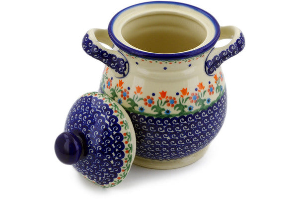 This Spring Flowers 8" Jar with Lid and Handles was handmade and hand decorated in Boleslawiec, Poland by skilled artisans according to old traditional methods. This Polish stoneware is microwave, dishwasher, freezer, and oven safe up to 480°F. It does not contain lead or cadmium. It is part of the Spring Flowers Collection.