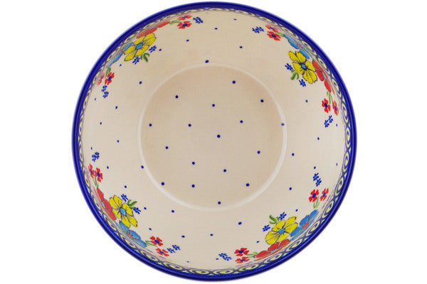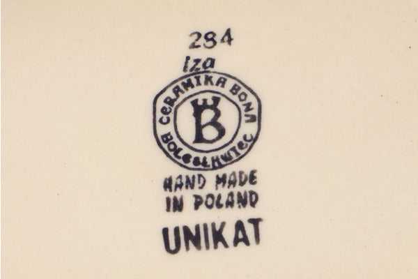 This Country Three 9" Mixing bowl, serving bowl was handmade and hand decorated in Boleslawiec, Poland by skilled artisans according to old traditional methods. This is a Polish pottery Signature Unikat, which means that it has been hand painted with both sponges and brushes and it is signed by the artist who painted it. Unikat pieces are the most intricate works of art. Larger Unikat items take hours of very careful work to finish. This Polish stoneware is microwave, dishwasher, freezer, and oven safe up to 480°F. It does not contain lead or cadmium. It is part of the Country Three Collection.
