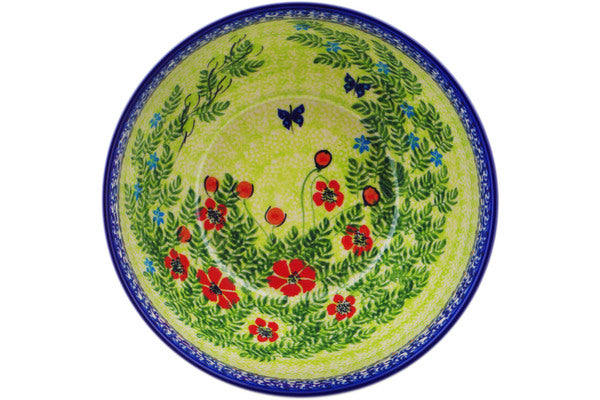 This Metamorphosis 9" Mixing bowl, serving bowl was handmade and hand decorated in Boleslawiec, Poland by skilled artisans according to old traditional methods. This Polish stoneware is microwave, dishwasher, freezer, and oven safe up to 480°F. It does not contain lead or cadmium. It is part of the Metamorphosis Collection.