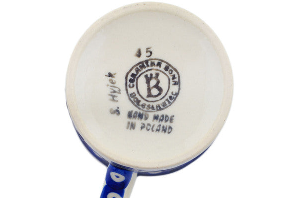 This Blue Eye Spring 8 oz Mug was handmade and hand decorated in Boleslawiec, Poland by skilled artisans according to old traditional methods. This Polish stoneware is microwave, dishwasher, freezer, and oven safe up to 480°F. It does not contain lead or cadmium. It is part of the Blue Eye Spring Collection.
