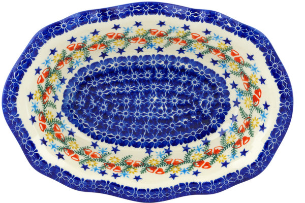This Wreath Of Bells 11" Oval Bowl was handmade and hand decorated in Boleslawiec, Poland by skilled artisans according to old traditional methods. This Polish stoneware is microwave, dishwasher, freezer, and oven safe up to 480°F. It does not contain lead or cadmium. It is part of the Wreath Of Bells Collection.