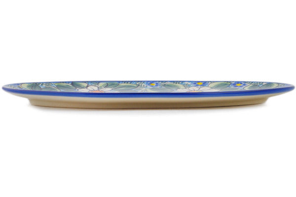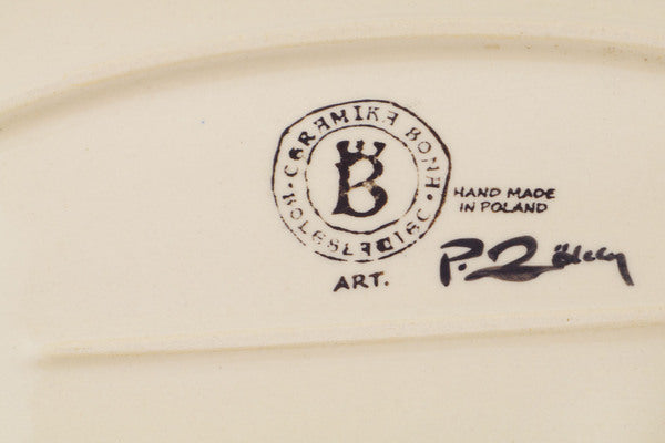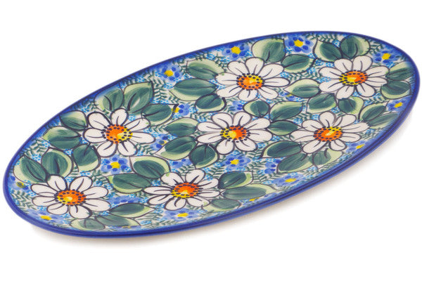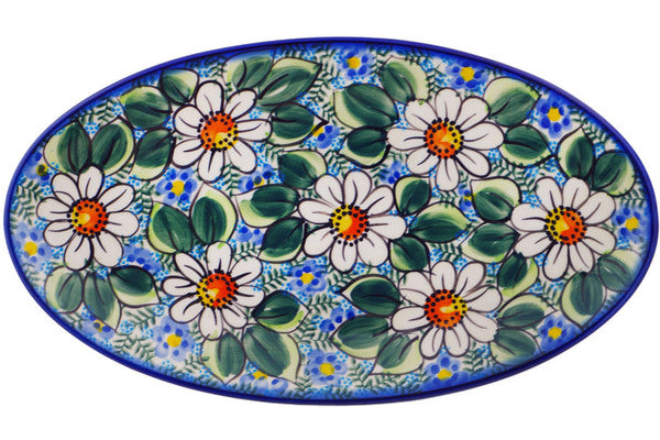This Daisy Blues 14" Oval Plate was handmade and hand decorated in Boleslawiec, Poland by skilled artisans according to old traditional methods. This is a Polish pottery Signature Unikat, which means that it has been hand painted with both sponges and brushes and it is signed by the artist who painted it. Unikat pieces are the most intricate works of art. Larger Unikat items take hours of very careful work to finish. This Polish stoneware is microwave, dishwasher, freezer, and oven safe up to 480°F. It does not contain lead or cadmium. It is part of the Daisy Blues Collection.