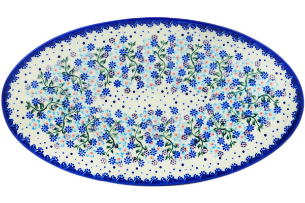 This Stormy Vines 14" Oval Plate was handmade and hand decorated in Boleslawiec, Poland by skilled artisans according to old traditional methods. This is a Polish pottery Signature Unikat, which means that it has been hand painted with both sponges and brushes and it is signed by the artist who painted it. Unikat pieces are the most intricate works of art. Larger Unikat items take hours of very careful work to finish. This Polish stoneware is microwave, dishwasher, freezer, and oven safe up to 480°F. It does not contain lead or cadmium. It is part of the Stormy Vines Collection.