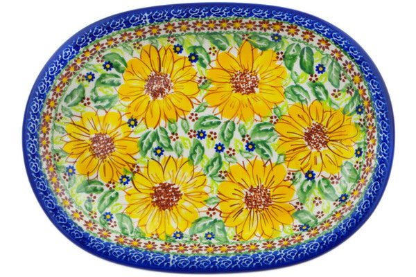 This Sunflower Yellow Petal Bliss 11" Oval Platter was handmade and hand decorated in Boleslawiec, Poland by skilled artisans according to old traditional methods. This is a Polish pottery Signature Unikat, which means that it has been hand painted with both sponges and brushes and it is signed by the artist who painted it. Unikat pieces are the most intricate works of art. Larger Unikat items take hours of very careful work to finish. This Polish stoneware is microwave, dishwasher, freezer, and oven safe up to 480°F. It does not contain lead or cadmium. It is part of the Sunflower Yellow Petal Bliss Collection.