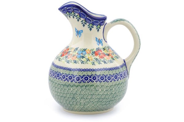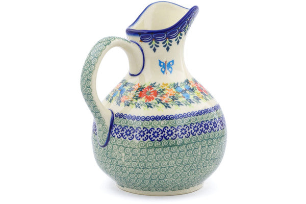 This Ring Of Flowers 5 Cup Pitcher was handmade and hand decorated in Boleslawiec, Poland by skilled artisans according to old traditional methods. This is a Polish pottery Signature Unikat, which means that it has been hand painted with both sponges and brushes and it is signed by the artist who painted it. Unikat pieces are the most intricate works of art. Larger Unikat items take hours of very careful work to finish. This Polish stoneware is microwave, dishwasher, freezer, and oven safe up to 480°F. It does not contain lead or cadmium. It is part of the Ring Of Flowers Collection.