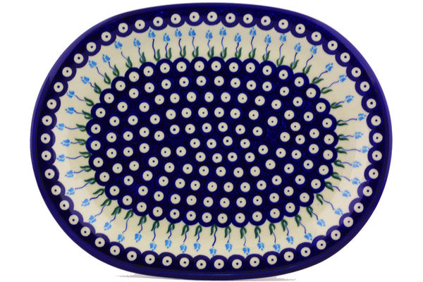 This Peacock Tulip Garden 14" Oval Platter was handmade and hand decorated in Boleslawiec, Poland by skilled artisans according to old traditional methods. This Polish stoneware is microwave, dishwasher, freezer, and oven safe up to 480°F. It does not contain lead or cadmium. It is part of the Peacock Tulip Garden Collection.