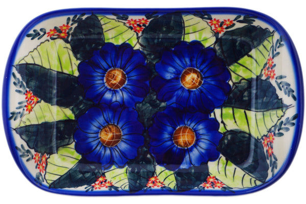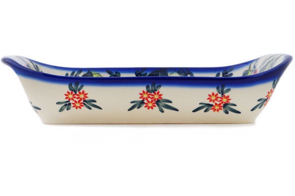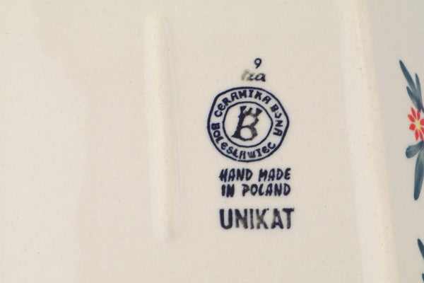 This Blue Bouquet 11" Platter with Handles was handmade and hand decorated in Boleslawiec, Poland by skilled artisans according to old traditional methods. This is a Polish pottery Signature Unikat, which means that it has been hand painted with both sponges and brushes and it is signed by the artist who painted it. Unikat pieces are the most intricate works of art. Larger Unikat items take hours of very careful work to finish. This Polish stoneware is microwave, dishwasher, freezer, and oven safe up to 480°F. It does not contain lead or cadmium. It is part of the Blue Bouquet Collection.