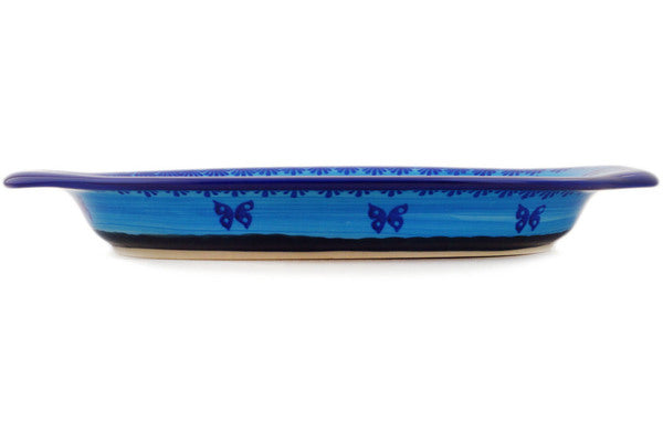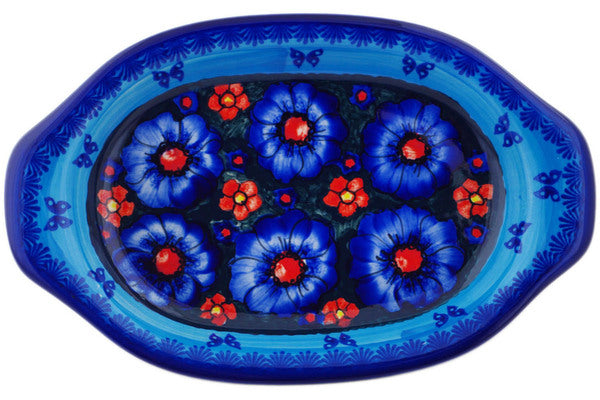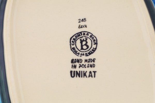 This Midnight Garden 12" Platter with Handles was handmade and hand decorated in Boleslawiec, Poland by skilled artisans according to old traditional methods. This is a Polish pottery Signature Unikat, which means that it has been hand painted with both sponges and brushes and it is signed by the artist who painted it. Unikat pieces are the most intricate works of art. Larger Unikat items take hours of very careful work to finish. This Polish stoneware is microwave, dishwasher, freezer, and oven safe up to 480°F. It does not contain lead or cadmium. It is part of the Midnight Garden Collection.