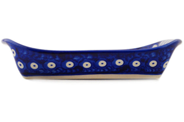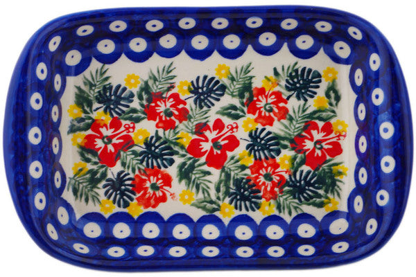 This Tropical Peacock 7" Platter with Handles was handmade and hand decorated in Boleslawiec, Poland by skilled artisans according to old traditional methods. This is a Polish pottery Signature Unikat, which means that it has been hand painted with both sponges and brushes and it is signed by the artist who painted it. Unikat pieces are the most intricate works of art. Larger Unikat items take hours of very careful work to finish. This Polish stoneware is microwave, dishwasher, freezer, and oven safe up to 480°F. It does not contain lead or cadmium. It is part of the Tropical Peacock Collection.