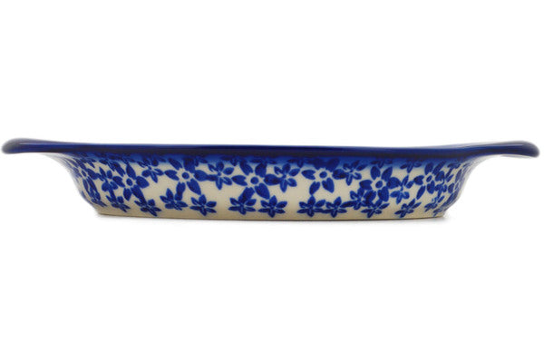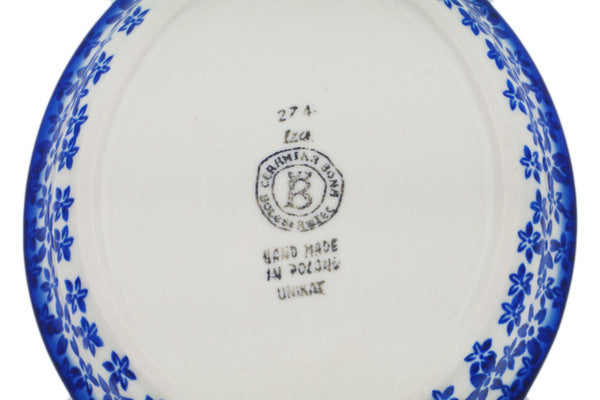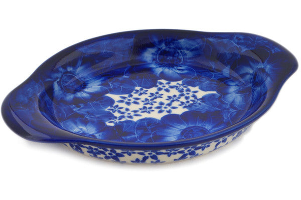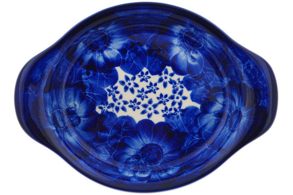 This Divine Cobalt 9" Platter with Handles was handmade and hand decorated in Boleslawiec, Poland by skilled artisans according to old traditional methods. This is a Polish pottery Signature Unikat, which means that it has been hand painted with both sponges and brushes and it is signed by the artist who painted it. Unikat pieces are the most intricate works of art. Larger Unikat items take hours of very careful work to finish. This Polish stoneware is microwave, dishwasher, freezer, and oven safe up to 480°F. It does not contain lead or cadmium. It is part of the Divine Cobalt Collection.