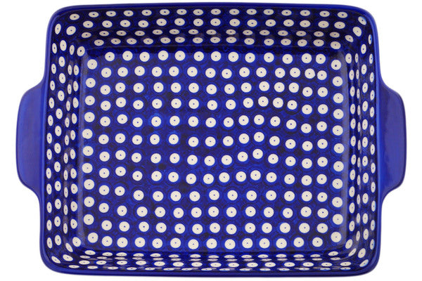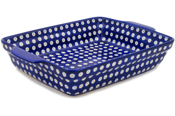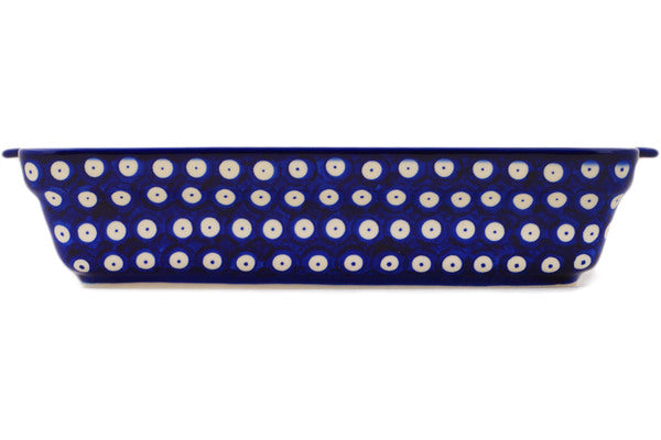 This Blue Eyed Peacock 15" Rectangular Baker with Handles was handmade and hand decorated in Boleslawiec, Poland by skilled artisans according to old traditional methods. This Polish stoneware is microwave, dishwasher, freezer, and oven safe up to 480°F. It does not contain lead or cadmium. It is part of the Blue Eyed Peacock Collection.