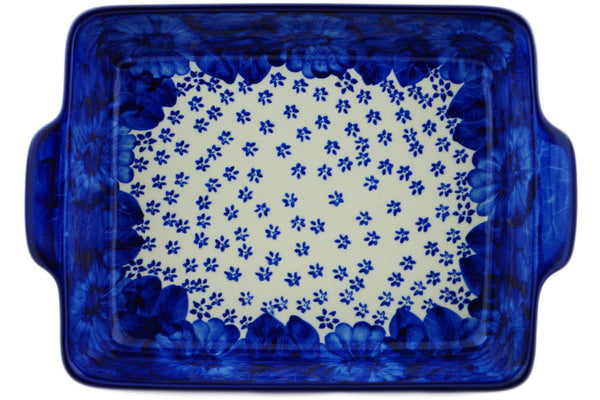 This Divine Cobalt 15" Rectangular Baker with Handles was handmade and hand decorated in Boleslawiec, Poland by skilled artisans according to old traditional methods. This is a Polish pottery Signature Unikat, which means that it has been hand painted with both sponges and brushes and it is signed by the artist who painted it. Unikat pieces are the most intricate works of art. Larger Unikat items take hours of very careful work to finish. This Polish stoneware is microwave, dishwasher, freezer, and oven safe up to 480°F. It does not contain lead or cadmium. It is part of the Divine Cobalt Collection.