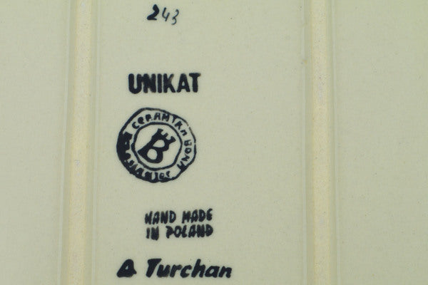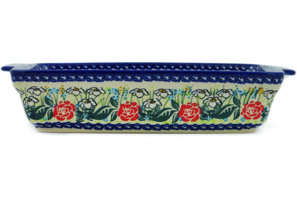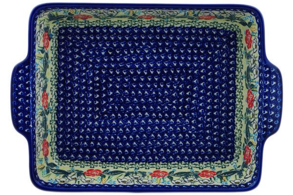 This Fresh Happiness 15" Rectangular Baker with Handles was handmade and hand decorated in Boleslawiec, Poland by skilled artisans according to old traditional methods. This is a Polish pottery Signature Unikat, which means that it has been hand painted with both sponges and brushes and it is signed by the artist who painted it. Unikat pieces are the most intricate works of art. Larger Unikat items take hours of very careful work to finish. This Polish stoneware is microwave, dishwasher, freezer, and oven safe up to 480°F. It does not contain lead or cadmium. It is part of the Fresh Happiness Collection.