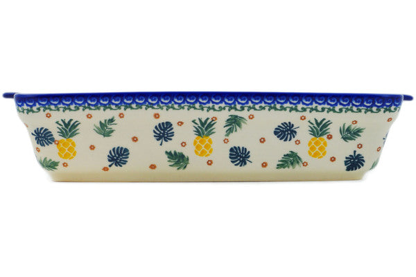 This Pineapple Parade 15" Rectangular Baker with Handles was handmade and hand decorated in Boleslawiec, Poland by skilled artisans according to old traditional methods. This Polish stoneware is microwave, dishwasher, freezer, and oven safe up to 480°F. It does not contain lead or cadmium. It is part of the Pineapple Parade Collection.
