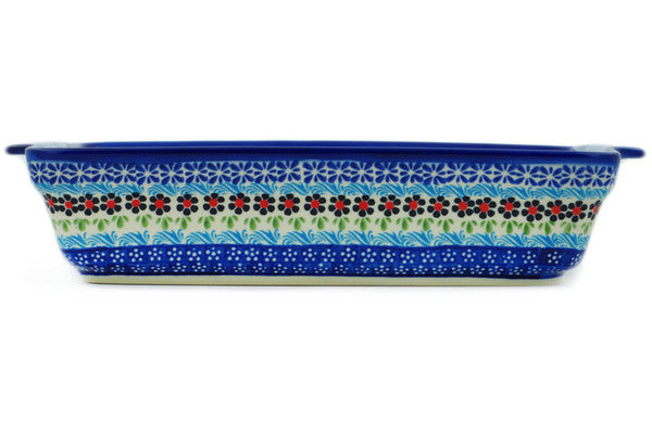 This Spring Country Trip 15" Rectangular Baker with Handles was handmade and hand decorated in Boleslawiec, Poland by skilled artisans according to old traditional methods. This Polish stoneware is microwave, dishwasher, freezer, and oven safe up to 480°F. It does not contain lead or cadmium. It is part of the Spring Country Trip Collection.