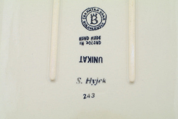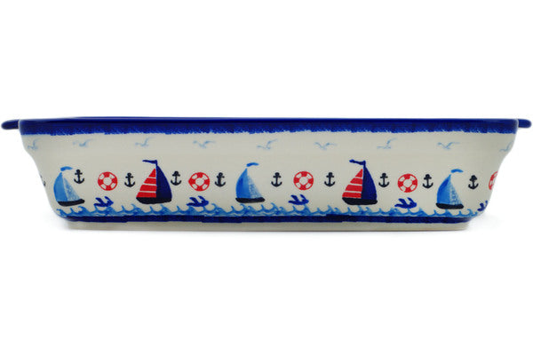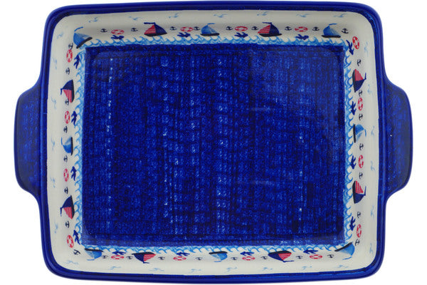 This Sweet Sailboats 15" Rectangular Baker with Handles was handmade and hand decorated in Boleslawiec, Poland by skilled artisans according to old traditional methods. This Polish stoneware is microwave, dishwasher, freezer, and oven safe up to 480°F. It does not contain lead or cadmium. It is part of the Sweet Sailboats Collection.