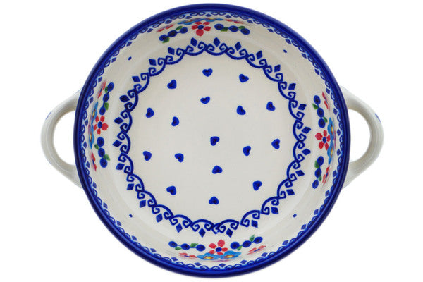 This Hearts And Flowers 8" Round Baker with Handles was handmade and hand decorated in Boleslawiec, Poland by skilled artisans according to old traditional methods. This Polish stoneware is microwave, dishwasher, freezer, and oven safe up to 480°F. It does not contain lead or cadmium. It is part of the Hearts And Flowers Collection.