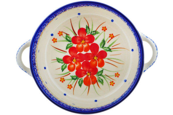 This Vermilion Clusters 8" Round Baker with Handles was handmade and hand decorated in Boleslawiec, Poland by skilled artisans according to old traditional methods. This Polish stoneware is microwave, dishwasher, freezer, and oven safe up to 480°F. It does not contain lead or cadmium. It is part of the Vermilion Clusters Collection.
